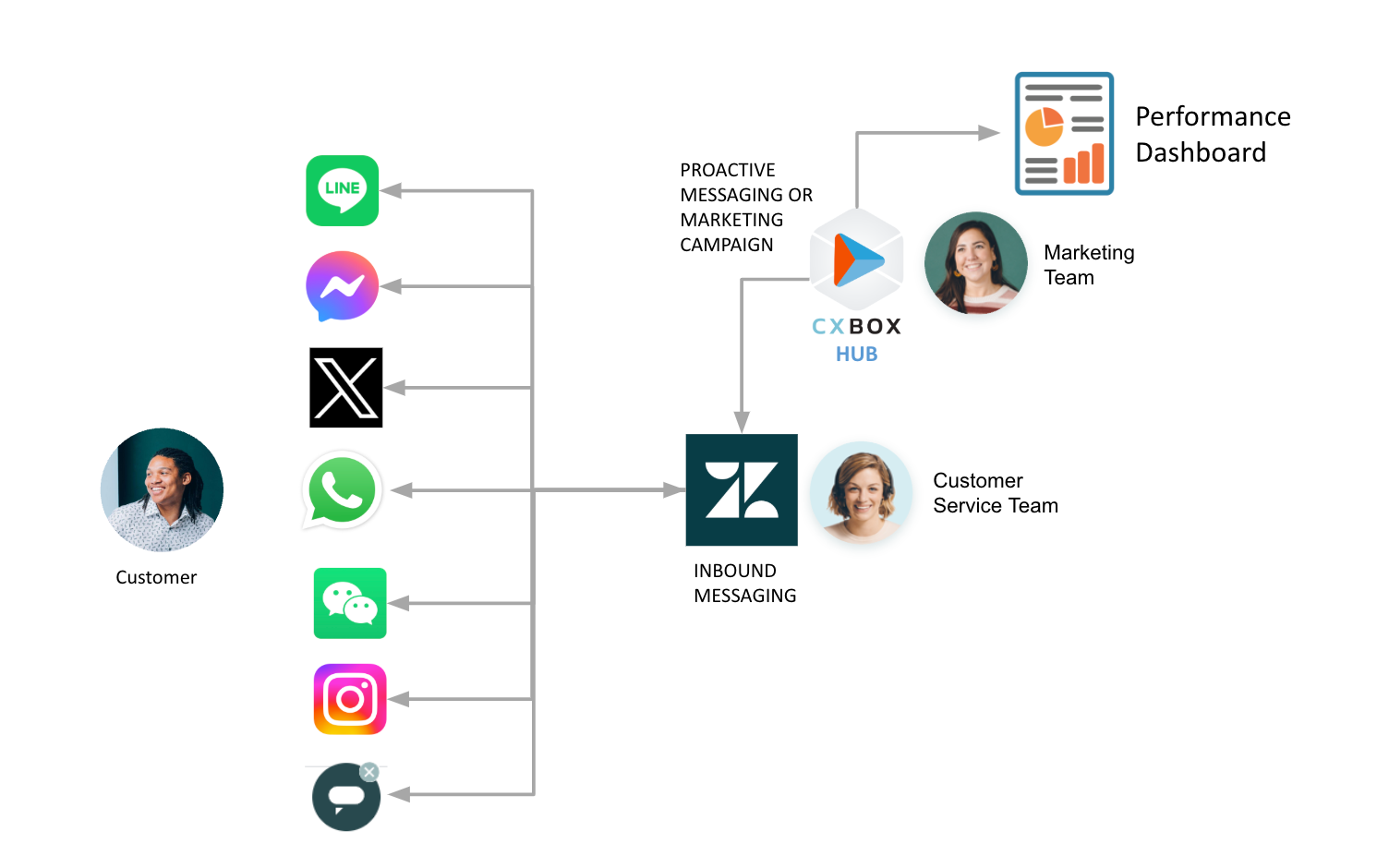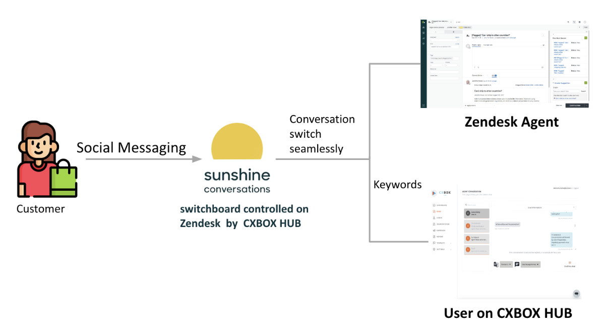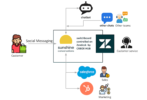 It helps organizations make the most of Zendesk’s Sunshine Conversations and Messaging API capabilities — features that many companies have but don’t yet fully utilize. By using CXBOX HUB, brands can enhance customer engagement efficiency across multiple chat channels. Here’s how it works: