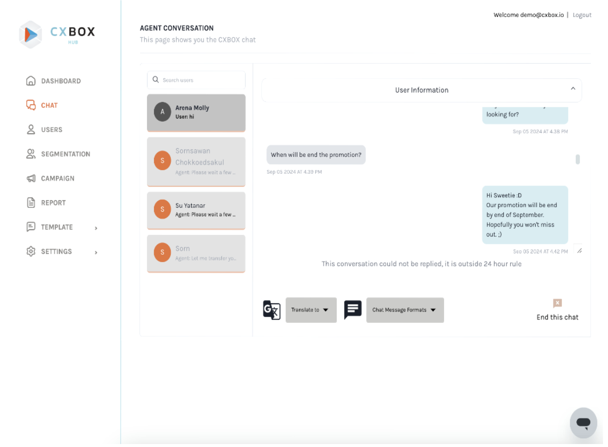 CXBOX HUB allows brands to send rich marketing messages such as text, images, locations, or carousel banners directly to customers via chat channels they are already using to contact the brand. It supports customer segmentation based on profiles or tags in Zendesk, enabling personalized messaging. Campaign performance — such as open rates, click-through rates, and reply rates — can also be easily monitored via an integrated dashboard.