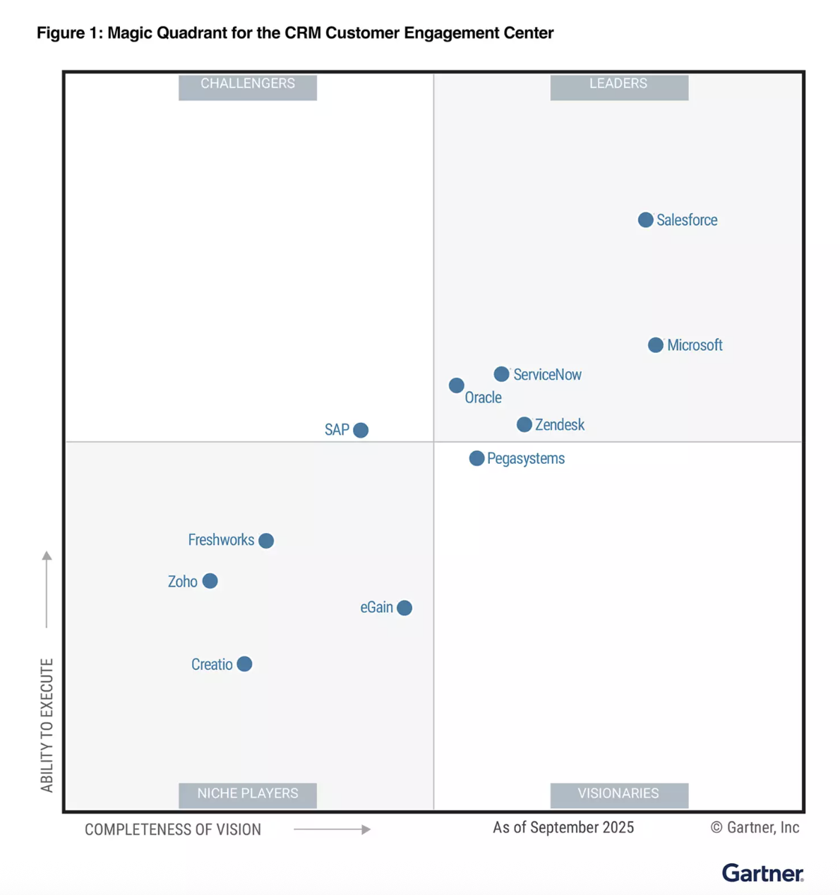 Gartner, Magic Quadrant for the CRM Customer Engagement Center, by Pri Rathnayake, Drew Kraus, Francesco Vicchi, Jim Robinson, 2025 年 10 月 27 日发布。